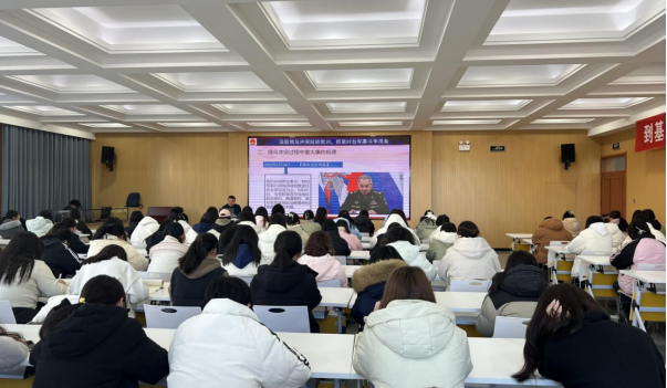 沈承福以“牢筑国防意识,厚植爱国情怀”为主题,结合自身专业和多年的军事研究,通过“俄乌冲突”等前热点事件,深入剖析了地缘政治冲突、军事战略博弈等,解读了国际安全形势的复杂性与严峻性,深刻阐释了国防建设在国家振兴进程中的重大意义,引导同学们要牢固树立国防意识,厚植爱国情怀,把个人理想融入中华民族伟大复兴。他鼓励同学们要珍惜时光、刻苦学习,强健体魄、拓展素质,努力成才、报效祖国。在活动环节,就同学们关心的报考军队文职和老员工应征入伍等热点话题进行了解答,热切鼓励有志护理学子,白衣红心立志从军,携笔从戎报效祖国,努力在绿色军营中锤炼意志、施展才华。